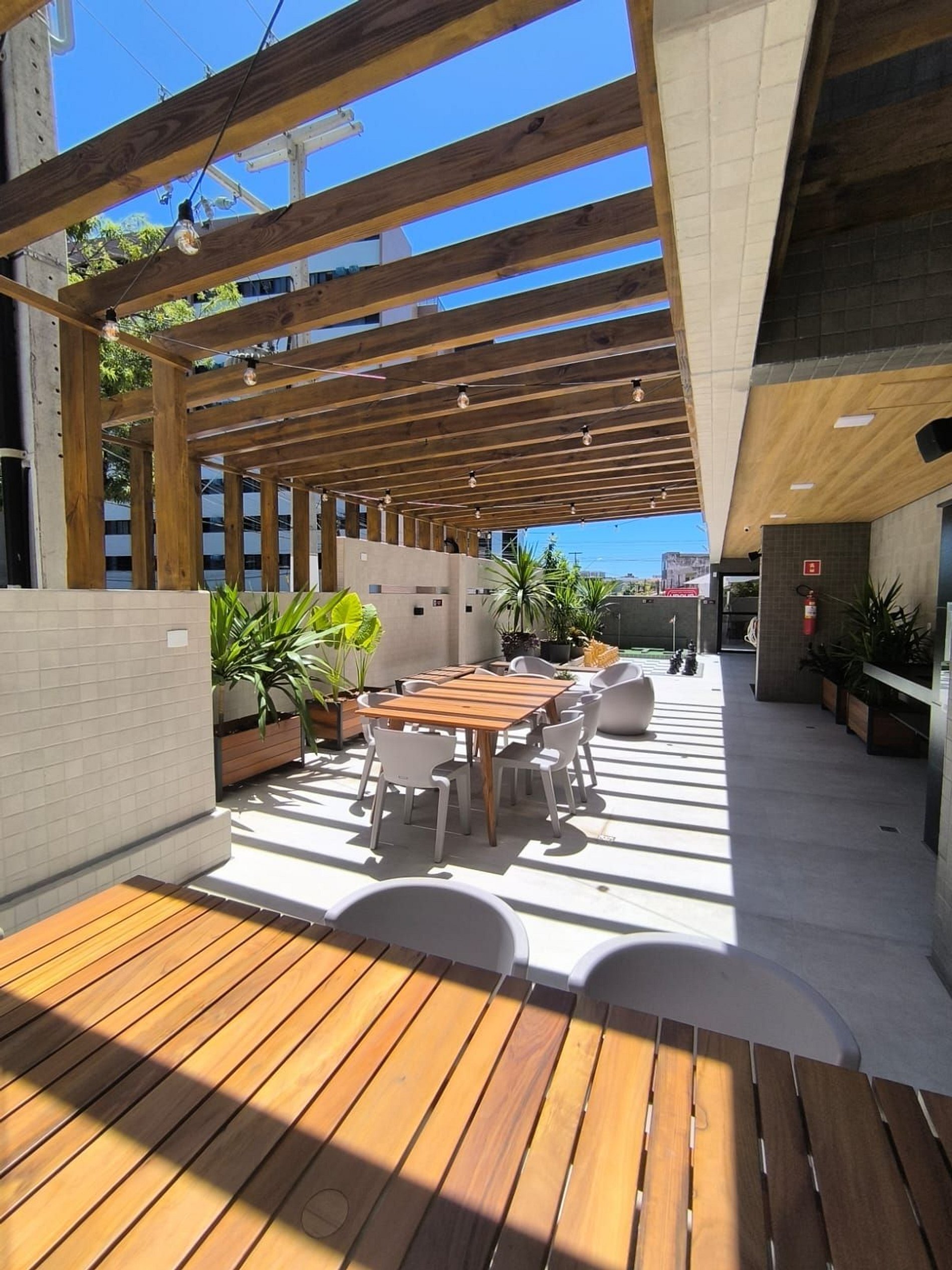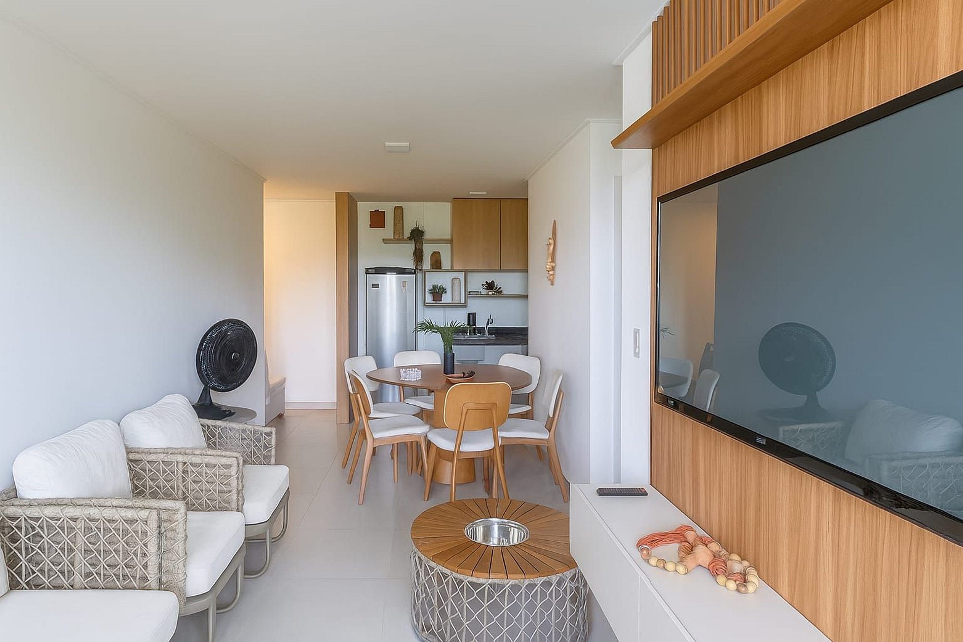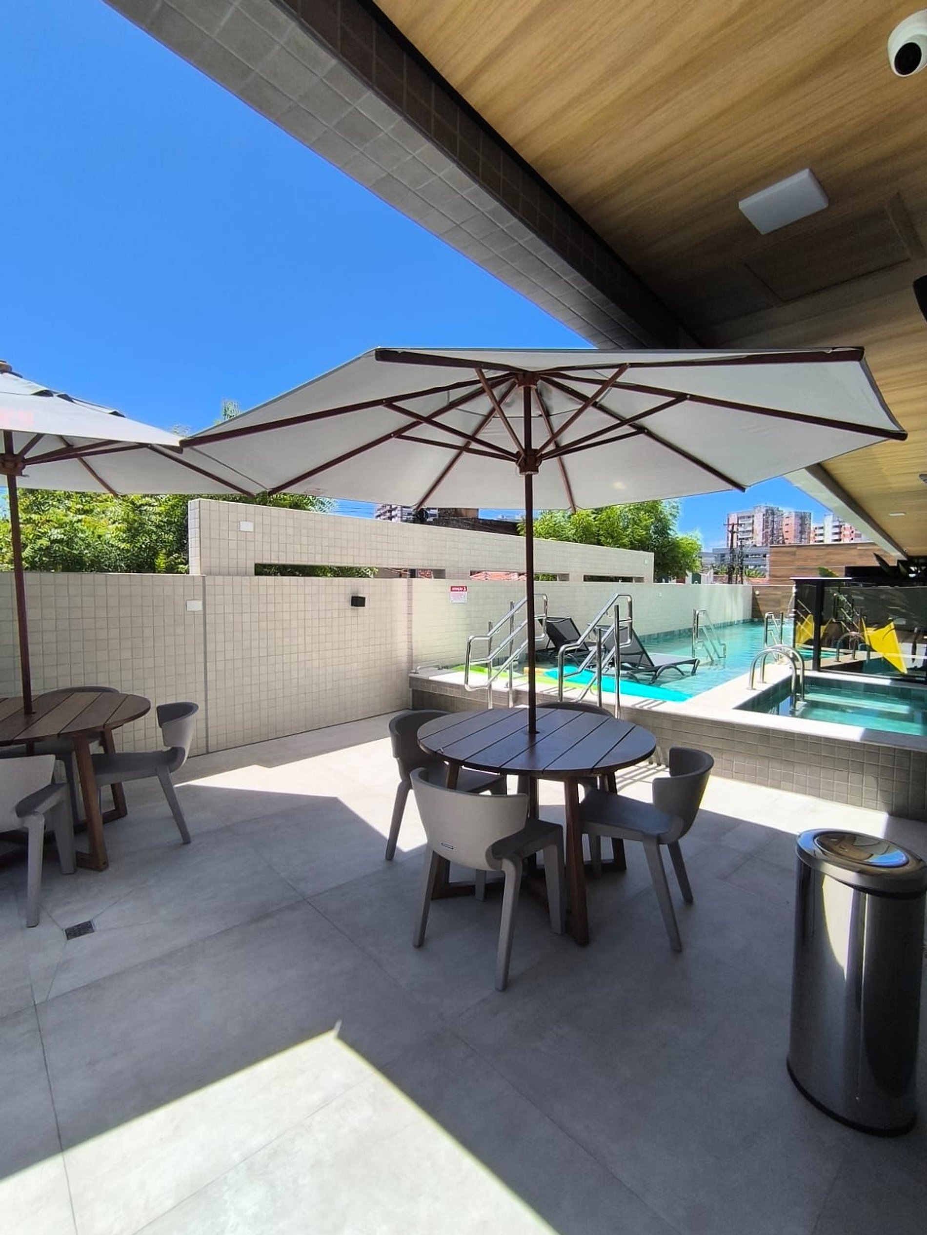 O espaço conta com cozinha totalmente equipada, enxoval completo (cama, mesa e banho) e áreas de lazer no prédio, como piscina, academia e espaço gourmet, garantindo uma estadia agradável e completa.